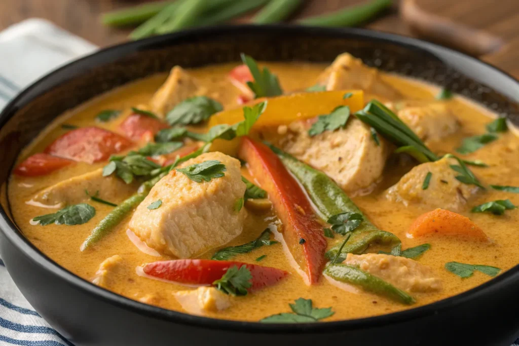 Simmer chicken pieces in coconut milk with ginger, lemongrass, and chili. Add mushrooms and a splash of lime juice. Cook until chicken is tender and serve garnished with cilantro.