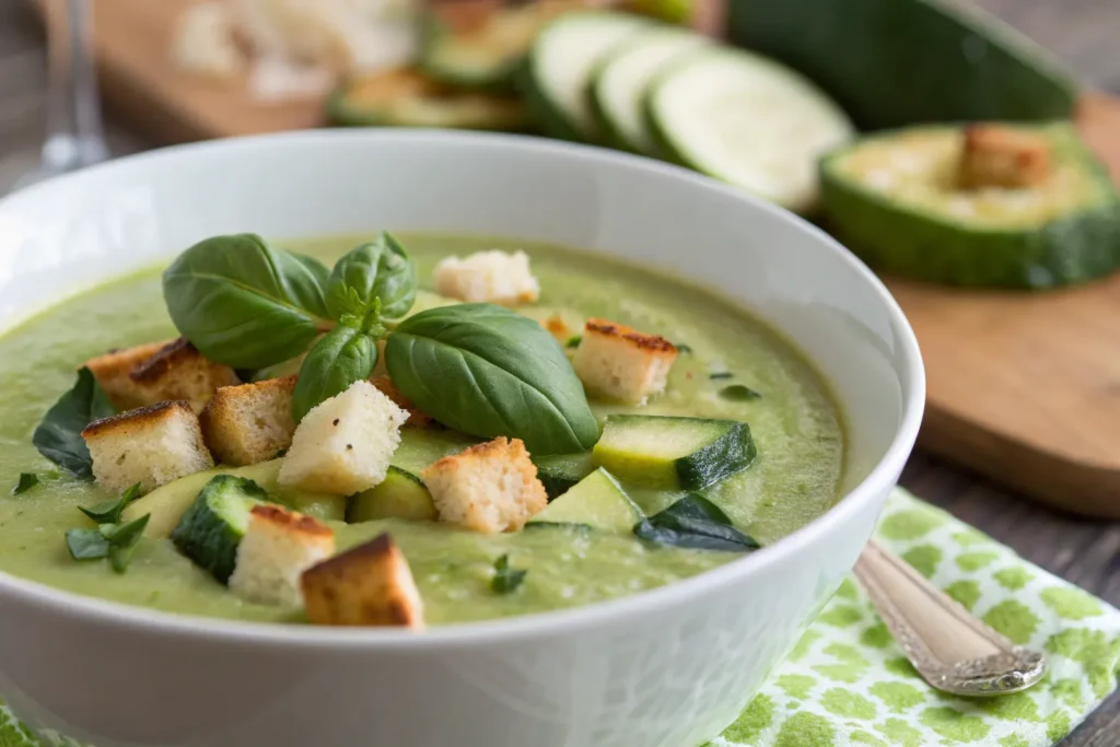 Sauté zucchini, onions, and garlic in olive oil until soft. Add vegetable broth and simmer for 10 minutes. Blend until smooth and stir in fresh basil and cream.
