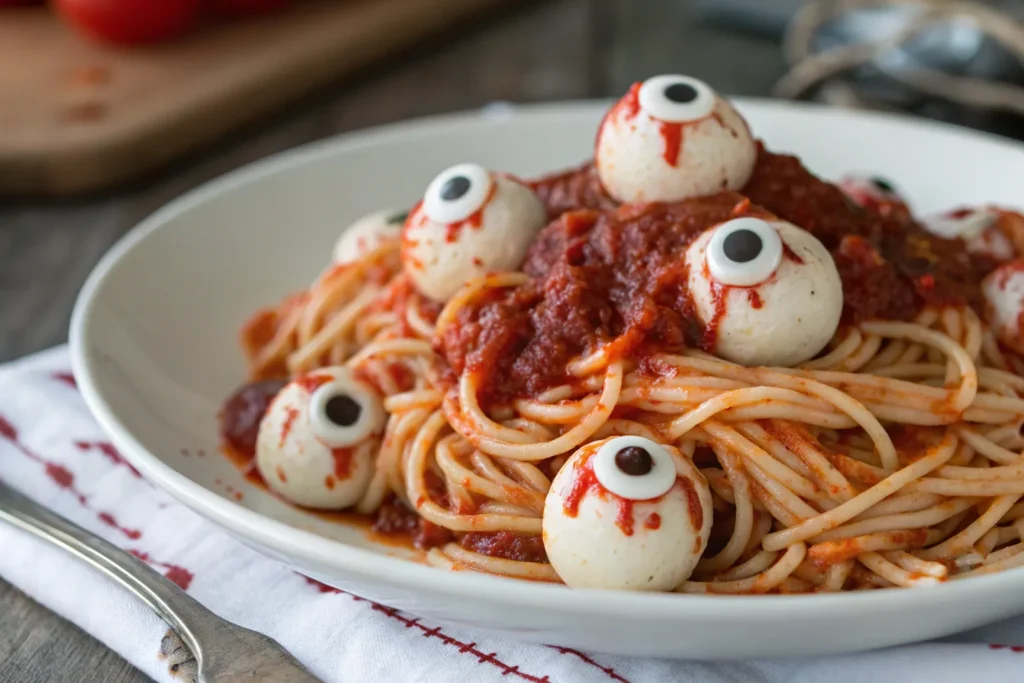 This chilling twist on a classic pasta dinner turns ordinary spaghetti into a creepy Halloween showstopper. The rich, vibrant red sauce becomes deliciously “bloody,” while olive-studded mozzarella balls transform into haunting little eyeballs staring up from the plate. It’s spooky enough to thrill kids and adults but still comforting and flavorful enough to satisfy everyone at the table. The perfect balance of eerie presentation and familiar taste makes this dish a Halloween must-have.