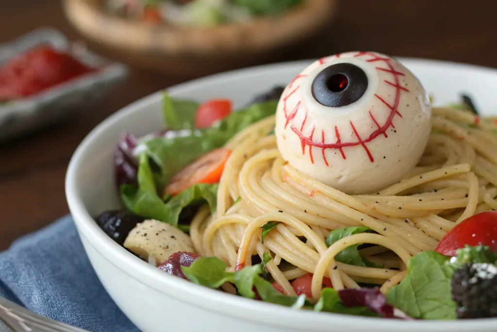 Explore the full Eyeball Pasta Salad recipe in the complete Halloween recipe guide for full preparation steps.