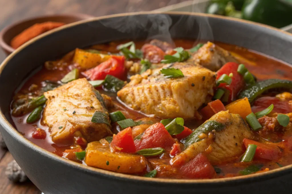 This bold stew features firm fish, tomatoes, onions, bell peppers, garlic, ginger, chili peppers, paprika, thyme, vegetable oil, and broth. Heat oil in a pot and sauté onions, peppers, garlic, and ginger until aromatic. Add tomatoes and spices, allowing the mixture to cook down into a thick, flavorful base. Pour in broth and simmer briefly before adding the fish. Cook gently until the fish is tender and infused with spice. Serve hot with rice or bread, adjusting the spice level as desired.