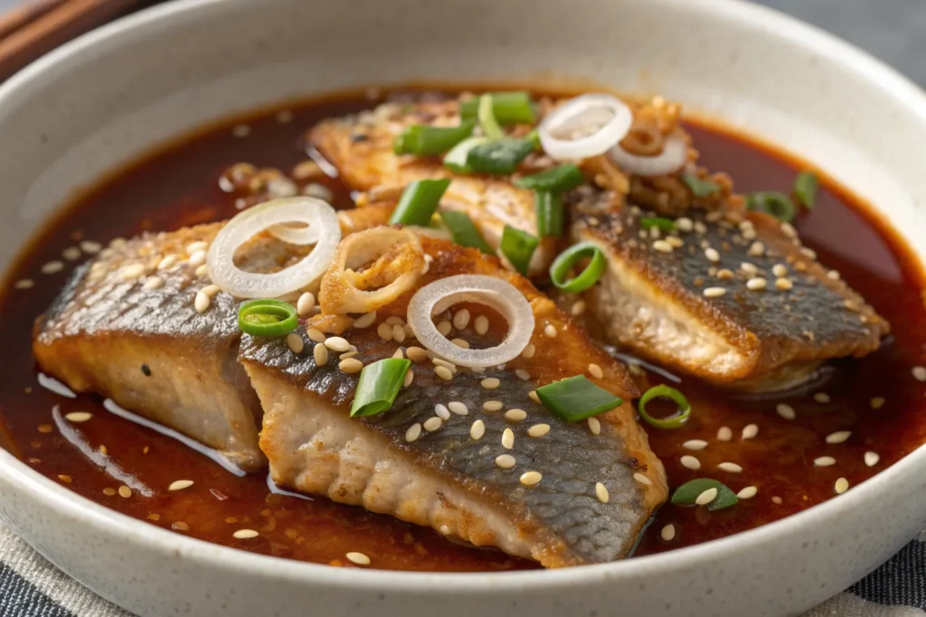 Korean-style braised yellow croaker is a deeply flavorful dish cooked in a spicy, savory sauce made from gochujang, soy sauce, garlic, and chili flakes. The fish is gently simmered with radish and onions, allowing it to absorb the rich sauce while staying tender. This dish is comforting, slightly spicy, and perfect for cold evenings. Served with rice, it becomes a complete and satisfying meal that showcases the bold flavors of Korean cuisine.