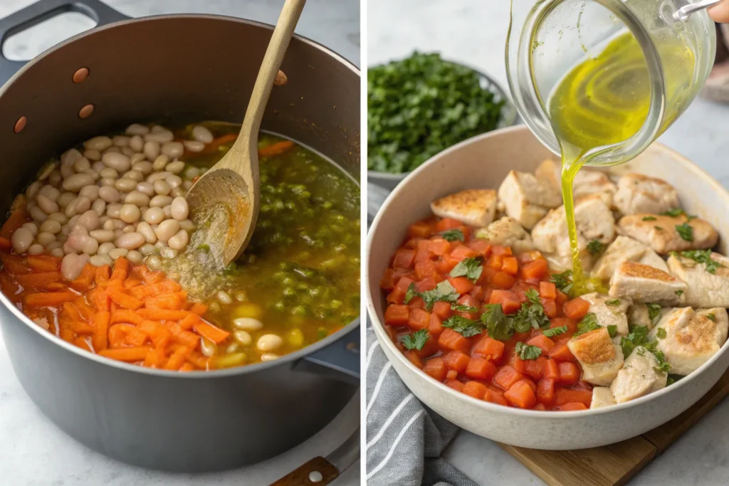 - Pour in chicken broth, tomatoes, and beans.