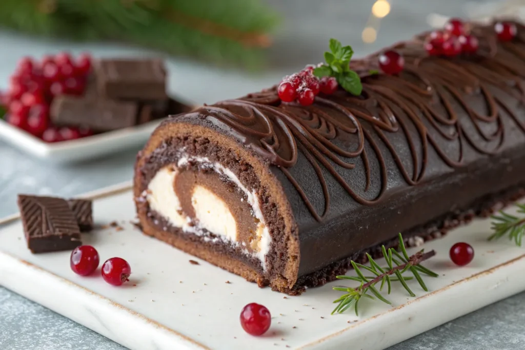 Store vegan yule log covered in the refrigerator for up to 3–4 days. Keep it chilled to retain ganache texture. Allow it to come to just under room temperature before slicing for best flavor and moistness. Ganache and whipped fillings can soften at room temperature, so keep it cool until serving.