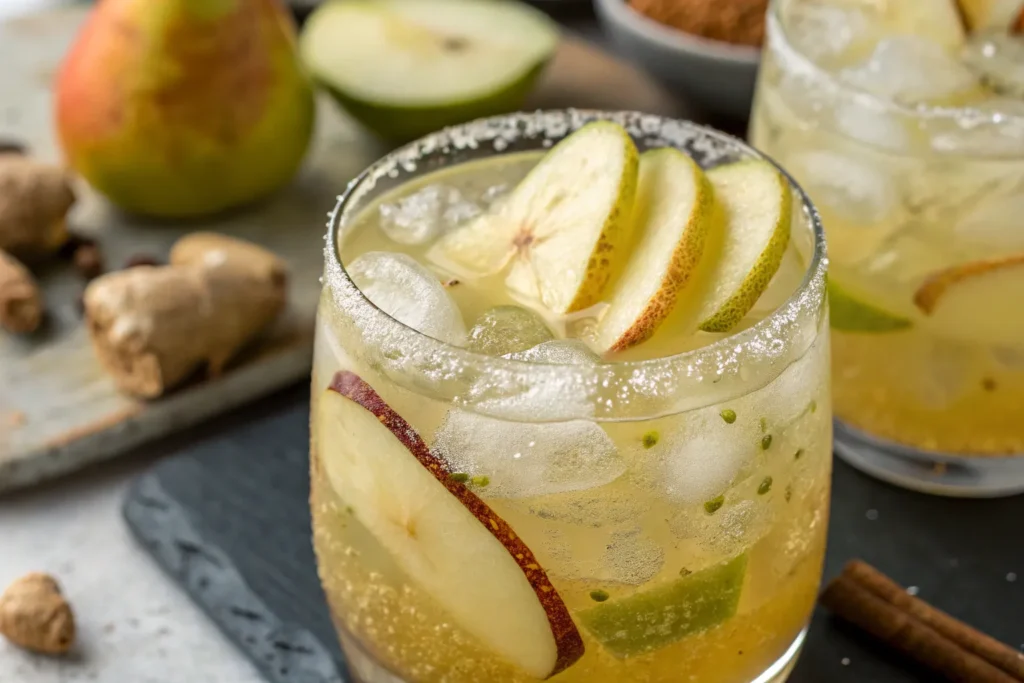 Pear juice, ginger syrup, and lemon juice create a tangy and warming flavor, perfect for winter evenings.