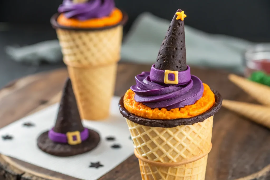 Decorative Halloween treats draw from centuries of folklore surrounding witches, harvest festivals, and seasonal celebrations. The pointed witch hat became a widely recognized symbol in the 18th and 19th centuries through literature and illustrations. Modern Halloween baking embraces this imagery, turning iconic symbols into playful treats. Witch Hat Cookie Cones represent this blend of tradition and modern creativity—handheld, charming, and perfect for festive gatherings.