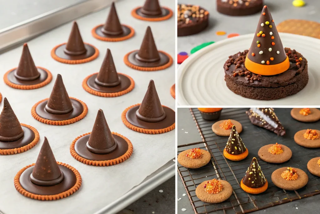 Make sure the melted chocolate isn’t too hot, or it may weaken the cones. When attaching the cones to the cookies, press gently but firmly so they stick without cracking. If using candy melts, adding a small amount of oil can help achieve a smoother consistency. Be patient during the chilling stage, the cleaner the set, the more polished your witch hats will look.